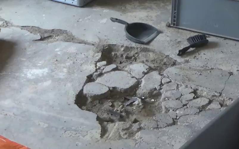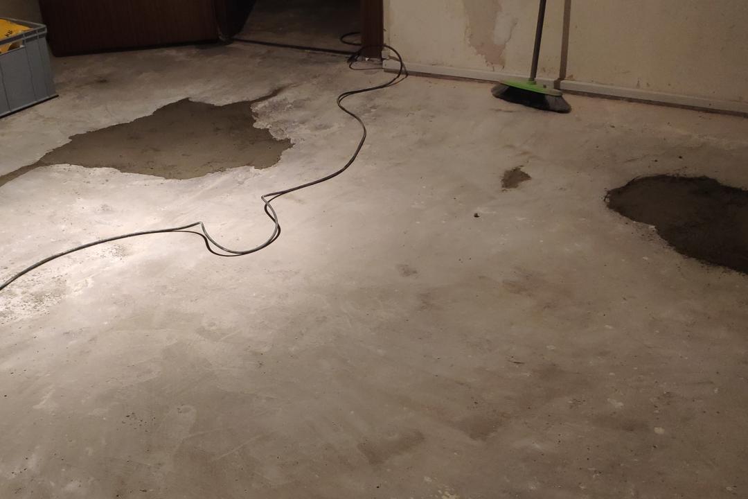 The holes largest holes were fixed by pouring new screed. The edges were filled with “reparatur beton” (concrete designed to fill such cracks).