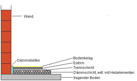 The structural components are uncoupled from the “estrich” (screed) by a thin film. On top of that comes the actual floor. The idea is to have hard material in the lowest layers and softer materials as we move upwards.