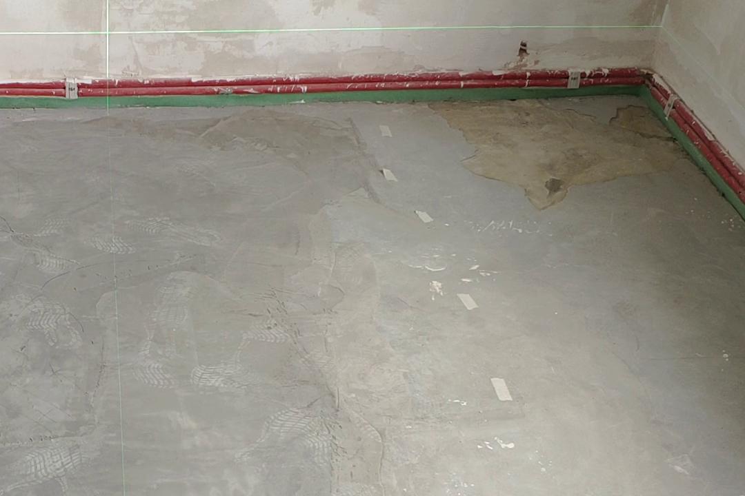 With knowledge of where the lowest valley is, we can then strategically pour leveling compound strategically in those sections first. This is necessary with such a broken floor. It is also much more effective than trying to fill the entire room in one go.