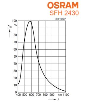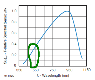 My leveling laser has a green laser. Green lasers have a wavelength of roughly between 495nm and 550nm. So we need photo diodes that have good sensitivity at that wavelength.