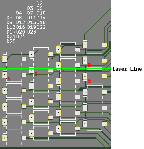 As seen in the image, if the laser line is at the pictured height, then photo diodes A, B, C and not D should read higher values than the rest of the board.
