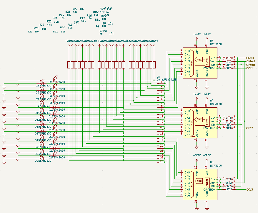 The photo diodes could be connected in a multiplexed fashion so save analog digital converters, but the risk and reduced ability to reuse the board for other purposes doesn’t outweigh the cost of the analog digital converters for me. A 24-port analog-digital board is useful for many projects by itself.
