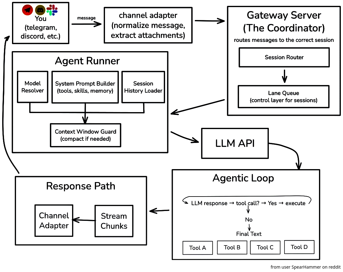 On Reddit a user “SpearHammer” posted a great architecture image of OpenClaw [3]. It helped me greatly in understanding OpenClaw. In essence OpenClaw retrieves messages from chat programs. It prompts the LLM, runs commands, if it needs to, and sends the responses back.