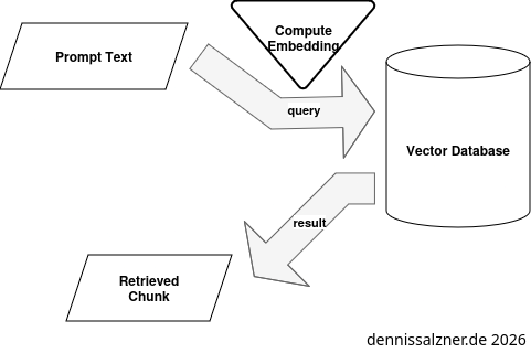 Retrieving information from the Vector Database is straight forward: an embedding vector is calculated in the same way for the prompt. It is then used to query the vector database. The database then returns the corresponding chunk.